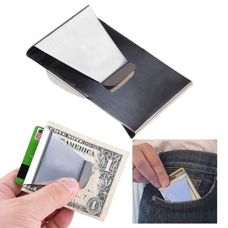 Ezüst színű rozsdamentes acél bankkártya, és pénztartó.